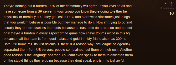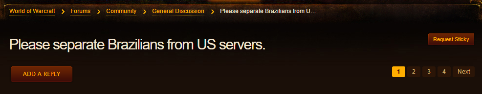 O tópico do nosso querido amigo já foi deletado, fico feliz que vários outros americanos tenham sido bastante contrários à posição dele e que a moderação tenha sido rápida na retaliação. Podemos querer um servidor presencial para melhorar nosso lag, mas não queremos nos separar por diferenças culturais dois povos por preconceito. Isso só aumentaria filas, diminuiria população nos reinos (que já são vazios mesmo com cross realm), e nossa comunidade não é grande o bastante para ser auto-suficiente. Não significa que somos dependentes dos norte-americanos, mas exigimos respeito pela convivência. E claro, se presenciar qualquer violência do tipo xenofóbica, não devolva na mesma moeda, dê print e denuncie para a Blizzard – garantimos que funciona, especialmente se a pessoa receber várias denúncias em um prazo curto de tempo. Sejamos um povo civilizado.