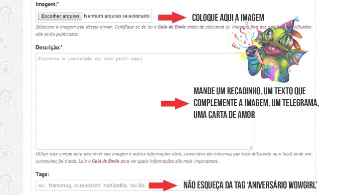 - Mande sua foto/screenshot com tema de aniversário e um recadinho pra gente usando nossa ferramenta no Espaço do Leitor, e com a tag “Aniversário WoWGirl”