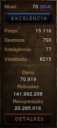 - Dano: Indica a média de dano por segundo que você causa com seus ataques. Este atributo é derivado das armas que você está usando, dos seus atributos principais, velocidade de ataque e chance de acerto crítico.