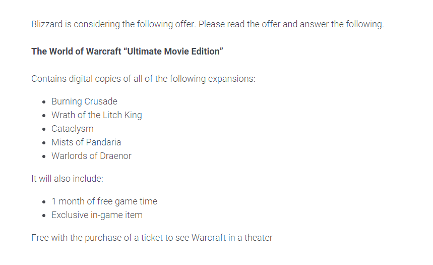 Há alguns meses atrás, um usuário do Reddit – possivelmente um funcionário da própria Blizzard – fez uma pesquisa de opinião perguntando sobre possíveis recompensas para quem assistisse ao filme de Warcraft nos cinemas.