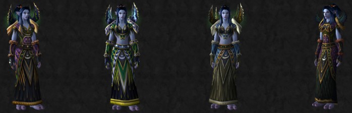 Dos quatro conjuntos dessa série, esse é o mais simples de ser obtido – e também o menor, infelizmente. 🙁 Ele é composto apenas de cinco partes, todas saqueáveis dos chefes das instâncias do Burning Crusade, e não inclui itens secundários como braçadeiras, botas e cinto.