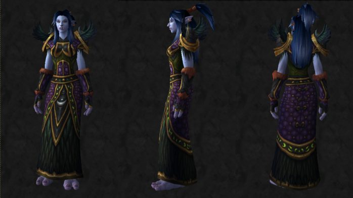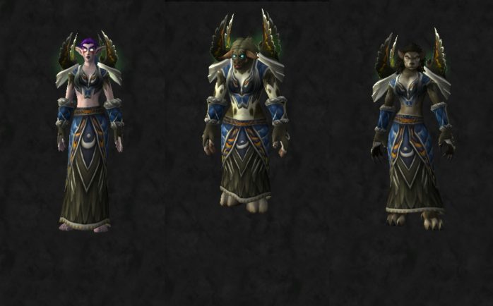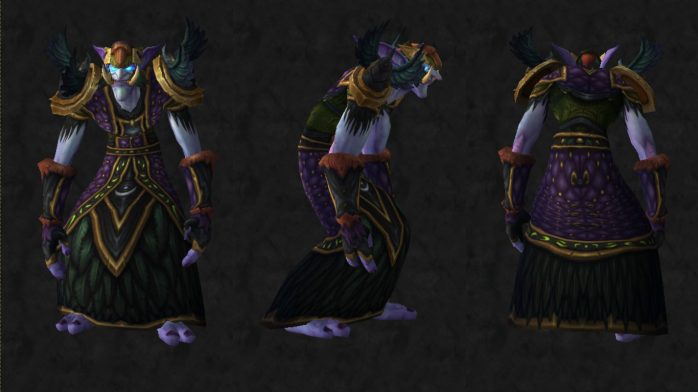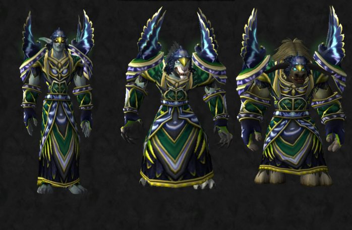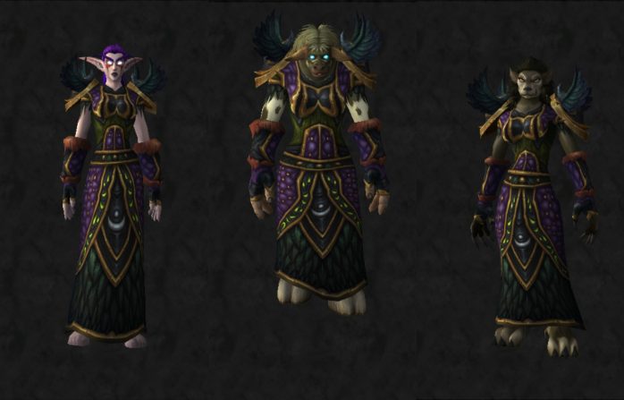 Está aí outro conjunto que não existe mais no jogo em sua versão original, também tendo sido retirado do jogo em Cataclysm. 🙁 Maaaaaas, assim como as Vestes do Coração Selvagem, hoje em dia podemos obter imitações das Vestes do Coração Feral na Feira de Negraluna, só que essas você compra com a Baruma: