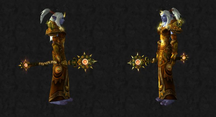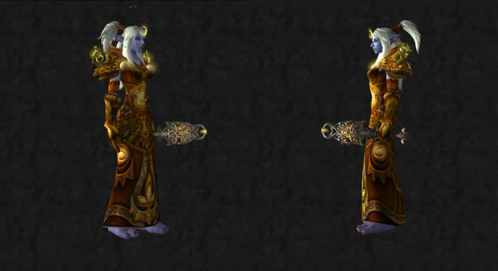- Torso: Trajes Noturcanto dos Valorosos, Vestimenta Noturcanto dos Valorosos e Veste Noturcanto dos Valorosos – todos vendidos por Valerie Langrom, em Dalaran, em troca de 1 Couraça do Subjugador Imprevisível (saque do Chefe Yogg-Saron)