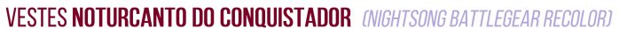 - Pernas: Guarda-pernas Noturcanto do Conquistador, Calças Noturcanto do Conquistador e Perneiras Noturcanto do Conquistador – todos saqueáveis do Chefe Emalon, o Vigia da Tempestade, e também vendidos por Valerie Langrom, em Dalaran, em troca de 1 Coxotes do Subjugador Imprevisível (saque da Chefe Freya)