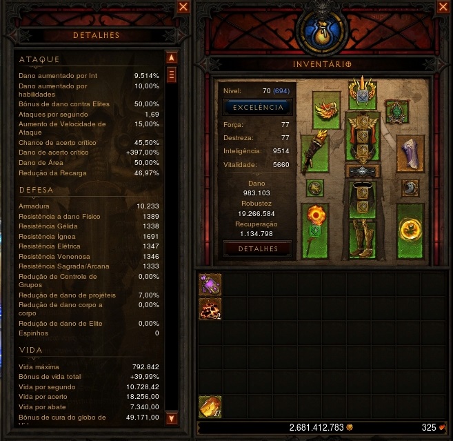 O Dano em Diablo é calculado a partir de vários fatores, ou eventos, independentes entre si mas que, conjuntamente, contribuem para dar “aquela força” na hora de enfrentar monstrinhos. Por definição, no jogo, o dano que o personagem causa por segundo é calculado “baseado em suas armas, atributos, velocidade de ataque, chance de acerto crítico, dano de acerto crítico, habilidades passivas e aumentos de velocidade de ataque com duas armas”. Essa informação você visualiza dentro do próprio jogo quando passa o mouse sobre o valor do dano.