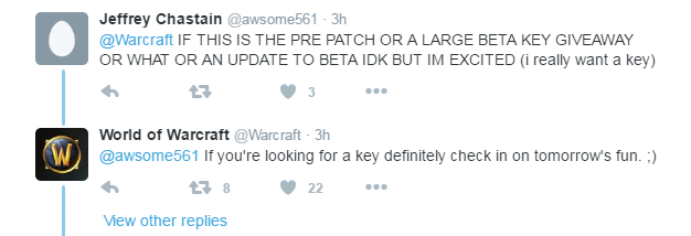 O evento Demon Bounties que mencionamos hoje, pra distribuição de chaves do beta começou! Ele vai acontecer no twitter, e será em parceria com geradores de conteúdo americanos. Você vai precisar logar no jogo, MATAR e tirar SS do corpo de demonios especificos de acordo com a hora. A cada duas horas você vai precisar de uma imagem de um tipo de demônio diferente e usar uma hastag diferente no twitter! Pra essa primeira leva, você vai precisar tirar e tweetar uma imagem de um dreadlord tirada por você com a hashtag Ordem: Horário – Gerador de Conteúdo – Tipo de demônio – Hashtag 12:00 – Towelliee – Dreadlords – #Towellieebounty 14:00 – Venruki – Shivarra – #Venrukibounty 16:00 – Bajheera – Wrath Guards – #Bajheerabounty 18:00 – Swifty – Felguards – #Swiftybounty 20:00 – Sloot – Eredar – #Slootbounty 22:00 – Sparty – Infernals – #Spartybounty Mais infos no post oficial em inglês. Olá, caros aventureiros! A Blizzard publicou um teaser em seu Twitter Oficial, sugerindo que nós nos uniremos para lutar contra a Legião hoje, 6 de Julho, ao meio dia (horário de Brasília). Se é um evento in-game, uma stream especial ou algum concurso, ainda não sabemos. Tomorrow, we're banding together to fight back the demonic presence of the Burning Legion; stay tuned. pic.twitter.com/VCP8nex8vb — World of Warcraft (@Warcraft) July 6, 2016 Amanhã, nós nos uniremos para lutar contra a presença demoníaca da Legião Ardente; fiquem ligados. A princípio, todos suspeitaram do Pré-Patch ou do acesso antecipado aos Caçadores de Demônio, mas a página oficial do Facebook já confirmou que não é nenhum desses dois. Um usuário do Twitter então perguntou se seria um evento de distribuição de chaves do Beta, e recebeu a seguinte resposta: Jeffrey Chastain: Isso é o Pré-Patch, uma grande distribuição de chaves do beta, ou uma atualização para o Beta, eu não sei, mas estou animado! (quero muito uma chave). World of Warcraft: Se você está procurando por uma chave, então definitivamente tem que conferir a diversão de amanhã 😉 Animados? Assim que tivermos mais informações, nós compartilharemos com vocês! /kiss, e até logo!