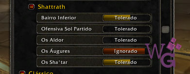 Dependendo da quantidade de reputação que você tiver, aparecerá conforme a imagem abaixo. Na imagem eu optei pela facção “Os Aldor” e por esse motivo em aparece “Tolerado” com eles e “Ignorado” com Os Áugures. Caso sua opção seja Os Áugures, em sua lista estará o contrário.