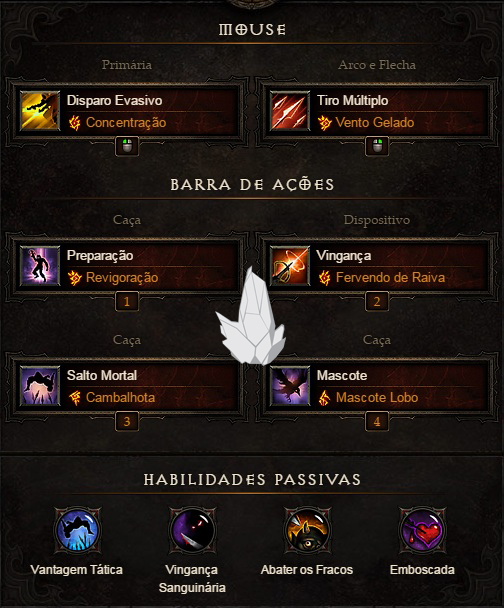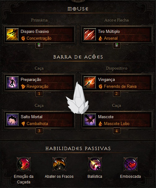 A sacada da build é gerar Ódio através do Disparo Evasivo e gastá-lo com Tiro Múltiplo. Manter o ritmo entre as duas habilidades vai sustentar os bônus de Foco e Presilhas ativos.