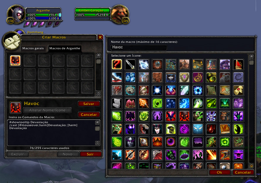 Outra super novidade é a interface de macros. Agora temos mais espaço para visualização de ícones na hora de criar uma (quero MUITO essa opção também para as abas de banco de guilda!):
