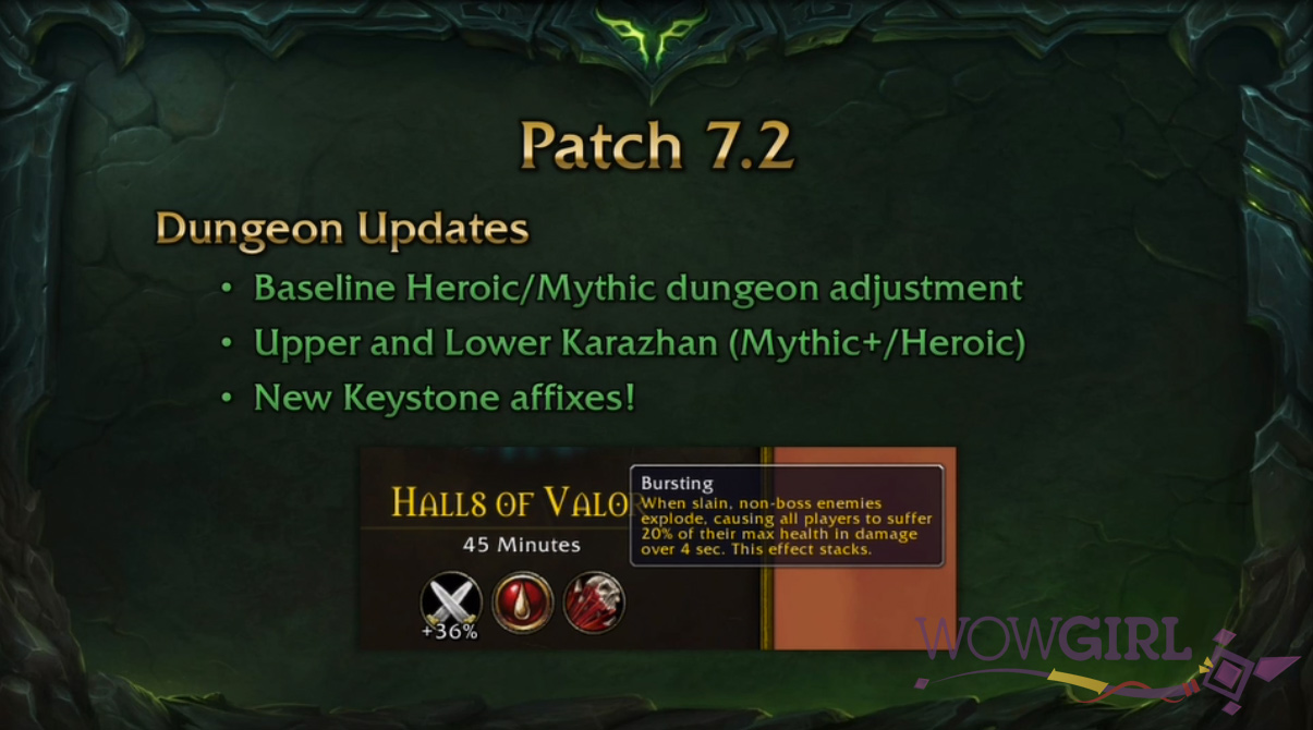 Além disso, para aumentar ainda mais a dificuldade das Mítico+, teremos novos afixos entrando na rotação! O novo afixo que foi usado de exemplo no painel da BlizzCon se chama Bursting (Explosivo, tradução livre). Com esse afixo, todos os inimigos não-chefões, ao morrerem, deixarão um debuff em todo o grupo, que dá 20% da vida máxima em dano por 4 segundos, podendo acumular. Quem já fez Il’gynoth Mítico já sabe como funciona. Vai ser divertido -n