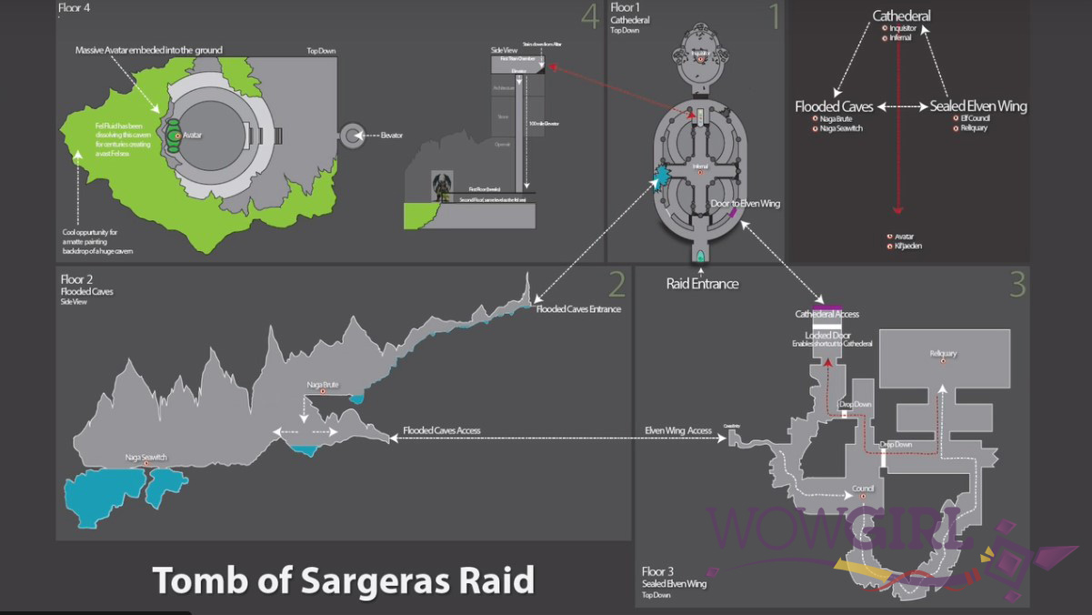 A raide será dividida em 4 partes, demonstrada no mapa nas imagens abaixo. Você entrará em uma área que parece uma catedral negra, e aonde a presença da Legião será sentida mais fortemente. Ao se aventurar mais na tumba, entraremos em um conglomerado de cavernas, aonde teremos que lidar com subordinados da Rainha Azshara, e exploraremos essa área (incluindo uma área que foi selada desde a época da Grande Cisão!) até encontrar o lugar da épica batalha entre a guardiã Aegwynn e o Avatar de Sargeras.