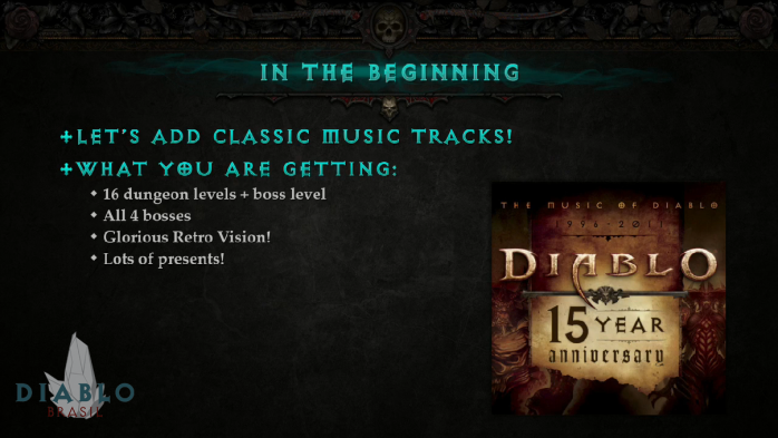 Como citado anteriormente aqui e aqui, uma das novidades em Diablo 3 é o Evento de Aniversário, comemorativo aos 20 anos da franquia. “The Darkening of Tristram” trará os 16 níveis da Catedral, os 4 chefes, um visual super retrô – pixelado e granulado – e a trilha sonora dos velhos tempos – além da movimentação tosca em 8 direções e o andar mais sexy de toda a história da franquia.