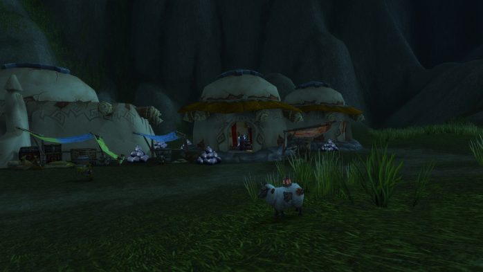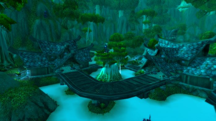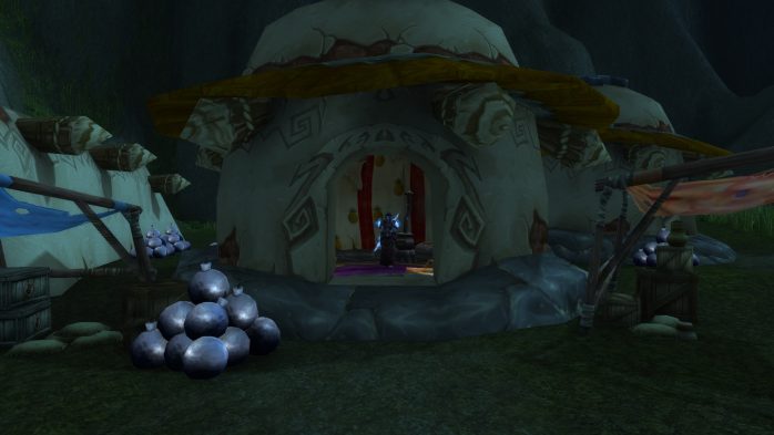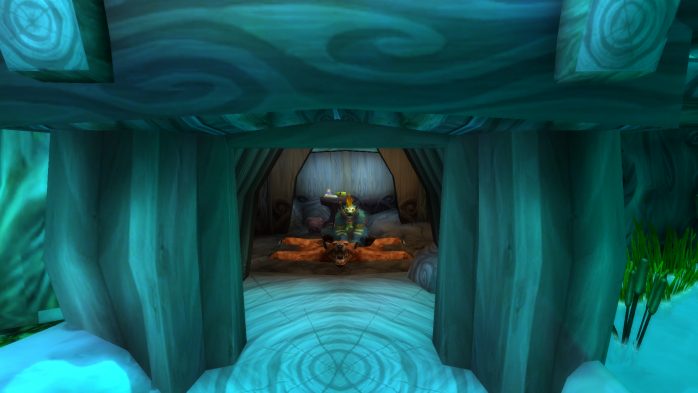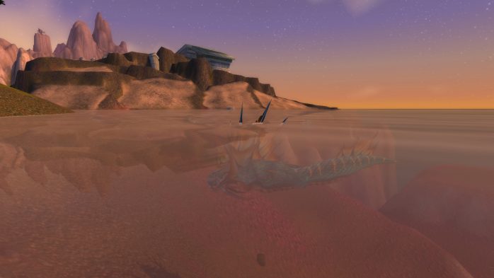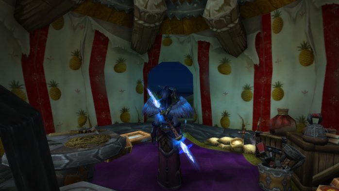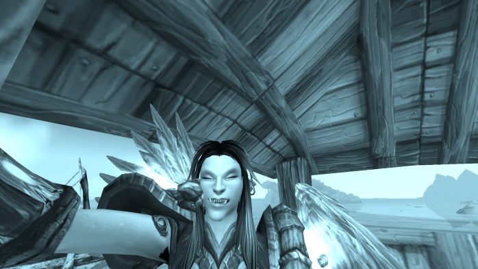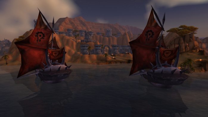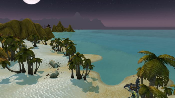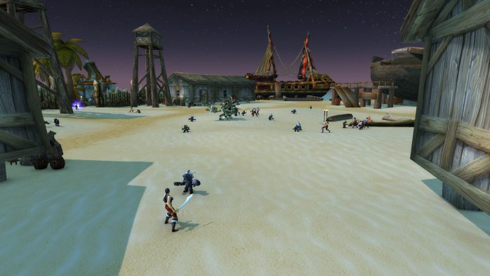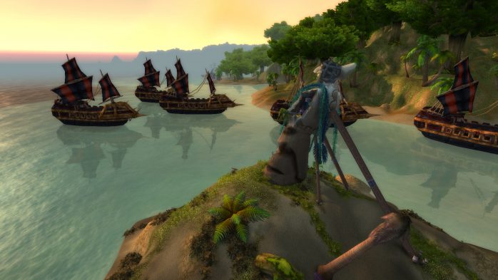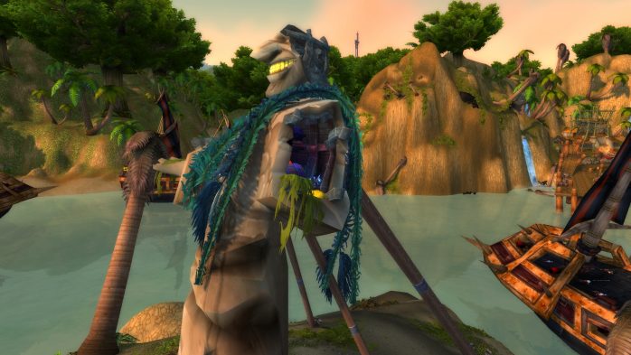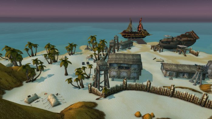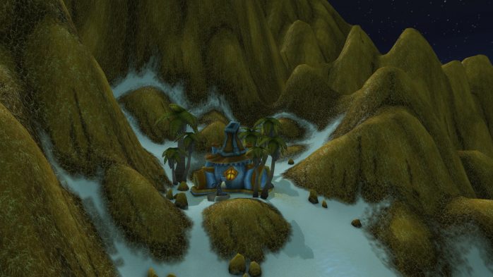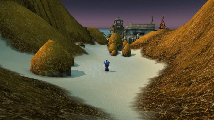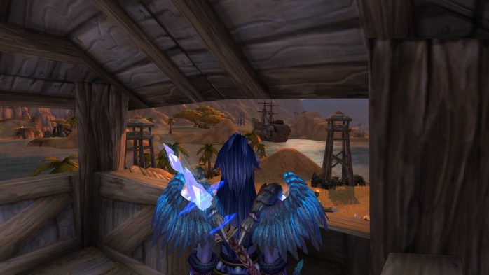 A Ilha da Peleja é esse pedacinho de terra exatamente embaixo de Durotar – então, adivinhem, tem muito navio da Horda envolvido. Como não seria sensato fazer com que parássemos dentro de um navio da Horda (Aliança ficaria como nessa situação, né?), paramos em uma guarita (secretamente eu chamo de “casinha do salva-vidas”) de madeira de frente para o mar, porque basicamente isso é tudo o que tem pra ver por lá. Ok? Ok.