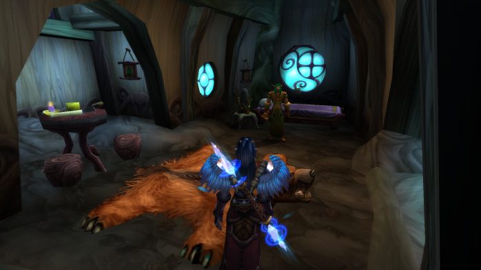 Mas se você não conhece o mapa, fiz um tour geral pra te mostrar todo esse clima druidístico. Primeiramente você precisa conhecer o Malvor, um treinador de herborismo que nos recebe nessa casinha contraditória (o que significa esse tapete de urso num mapa de Druidas, pessoal?).