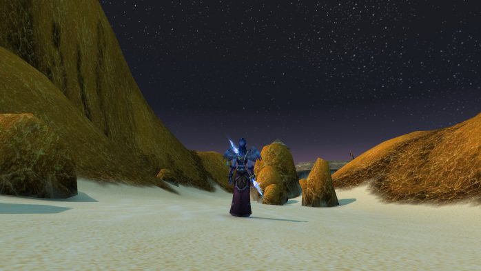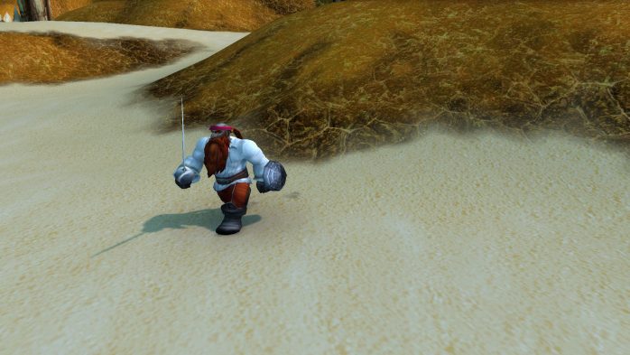Estão vendo a caminha? O armarinho? As cadeirinhas, a escadinha? Aparentemente, essa casinha pertence ao espectro de um gnomo – que por acaso é um mob raro, a Reflexão Distorcida de Narain (mas ele é nível 45, então estamos seguros). Com um pouco de sorte, ele inclusive estará dentro da casinha quando você aparecer por lá, como foi o meu caso. O saque não é nada de mais, mas eu fui pesquisar a história desse gnomo e li que, na realidade, essa versão malvada não é a real (duh, é uma reflexão apenas). De fato, ele está são e salvo em outra localidade em Tanaris e se chama Narain Suavestilo, é amigável e te dá até missões, olha só que encantador. Se você também quiser ir até lá fazer uma visitinha, a coordenada exata do Narain bonzinho é 55.2, 60.3. Claro que fui verificar com meus próprios olhos e tenho ibagens: