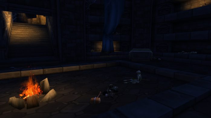 Notou essa aura de cenário de filme de terror? Tá escuro, só tem gente morta… Mas a fogueira e as velas estão acesas. Fica o mistério. Pelas minhas pesquisas, a cena se é uma referência ao Conan, em especial pelo esqueleto sentado no trono com uma espada na mão. Não confirmo porque nunca vi, mas se alguém souber do que se trata, favor comentar. 🙂