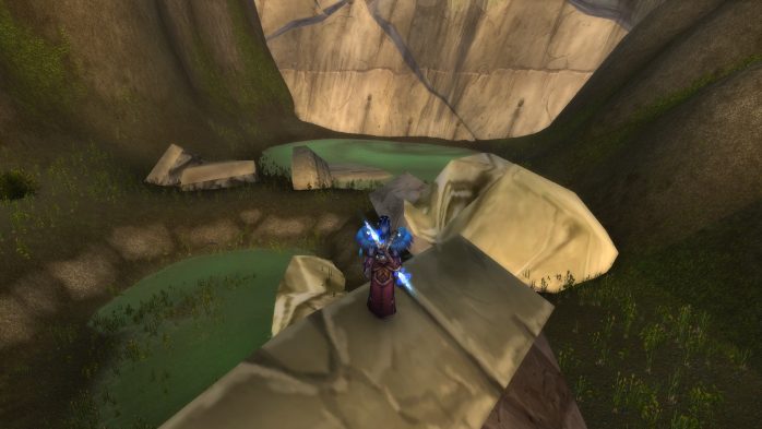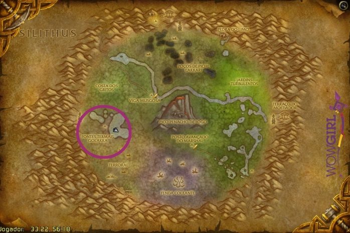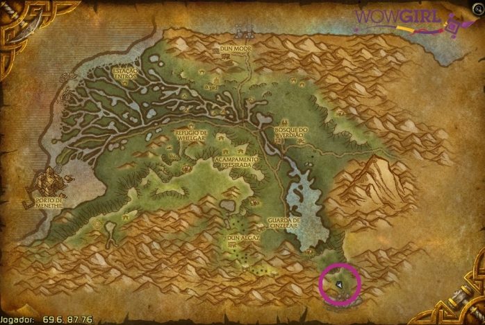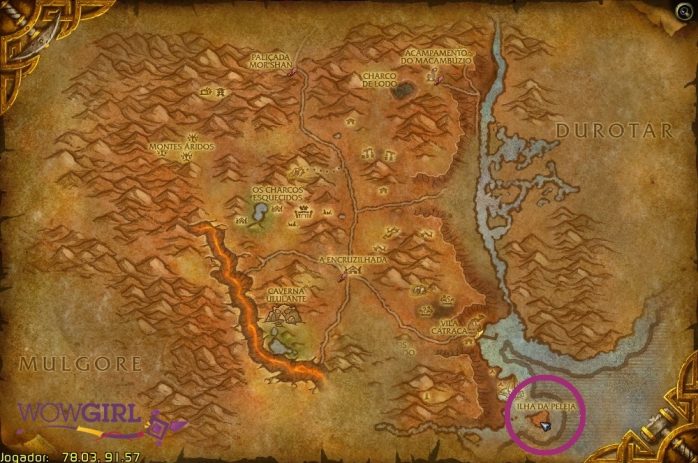 Essa área fica bem na divisa com Loch Modan, o mapa logo abaixo de Pantanal – tão divisa que o próprio WoW acusa que a zona pertence a Loch Modan, mas na realidade ainda estamos no território de Pantanal. Fiz mais algumas screenshots em outros ângulos e à noite para vocês observarem bem a região: