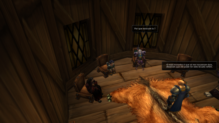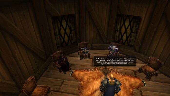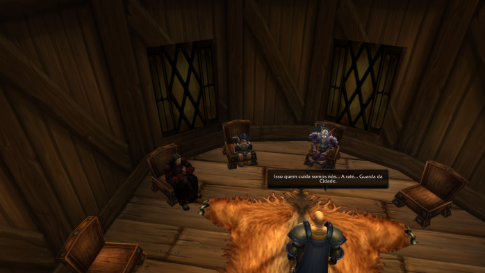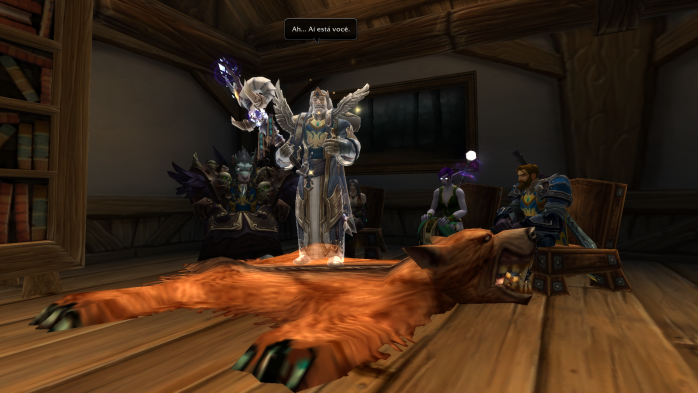 “E quem disse que eu preciso de apresentações? É óbvio que todos já me conhecem! Afinal, fui eu que derrotei o Asa da Morte com uma mão amarrada nas costas e os olhos vendados! Pobre dragãozinho… até pediu misericórdia antes de morrer. Sou a mais alta de toda minha família e não fique achando que você é tão mais alto que eu não, viu? São essas suas ombreiras espalhafatosas que te fazem ficar uns centímetros mais alto que eu. Venho de uma linhagem muito nobre. Minha prima Kinndy era aprendiz da grande Jaina Proudmore, mas infelizmente ela morreu naquele trágico incidente em Theramore. Era pra eu estar lá, lutando com ela, mas ela pediu para ficar em Dalaran e cuidar do meu tio Guido e minha tia. Depois da morte dela, jurei proteger a todos que amo e não tenho medo do perigo! E aí? Vai encarar?”