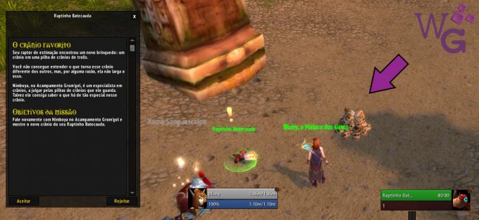 - Chegando no Acampamento Grom’gol, você deve procurar pelo PNJ Comandante Aggro’gosh, que vai te dar a missão A defesa de Grom’gol: o risco dos raptores. Para completar essa missão, você deve destruir 12 Ovo de Batecauda.