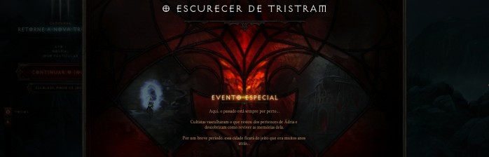Uma das primeiras mudanças que você vai sentir ao logar é que o jogo vai abrir direto numa tela fazendo referência ao Escurecer de Tristram. Evento anual que teremos sempre em Janeiro e que comemora o aniversário do nosso amado joguinho. Para saber mais detalhes sobre o envento, o Aslamn fez um post bem legal, dá uma olhada!