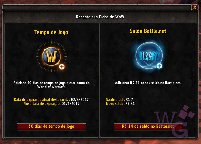 Uma novidade esperada por muitos desde o anúncio prévio feito na BlizzCon de 2016 foi finalmente implementada: agora além de adicionar 30 dias de tempo de jogo com as Fichas de WoW, é possível também adicionar a ficha como Saldo na sua conta da Battle.net!