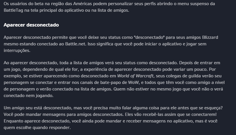 Meu sonho de princesa foi realizado nesse dia de hoje: a Blizzard anunciou uma atualização (ainda em beta, mas todos podem testar, só fazer o download) em que FINALMENTE está disponível a opção de aparecer offline enquanto joga/está conectado no aplicativo!