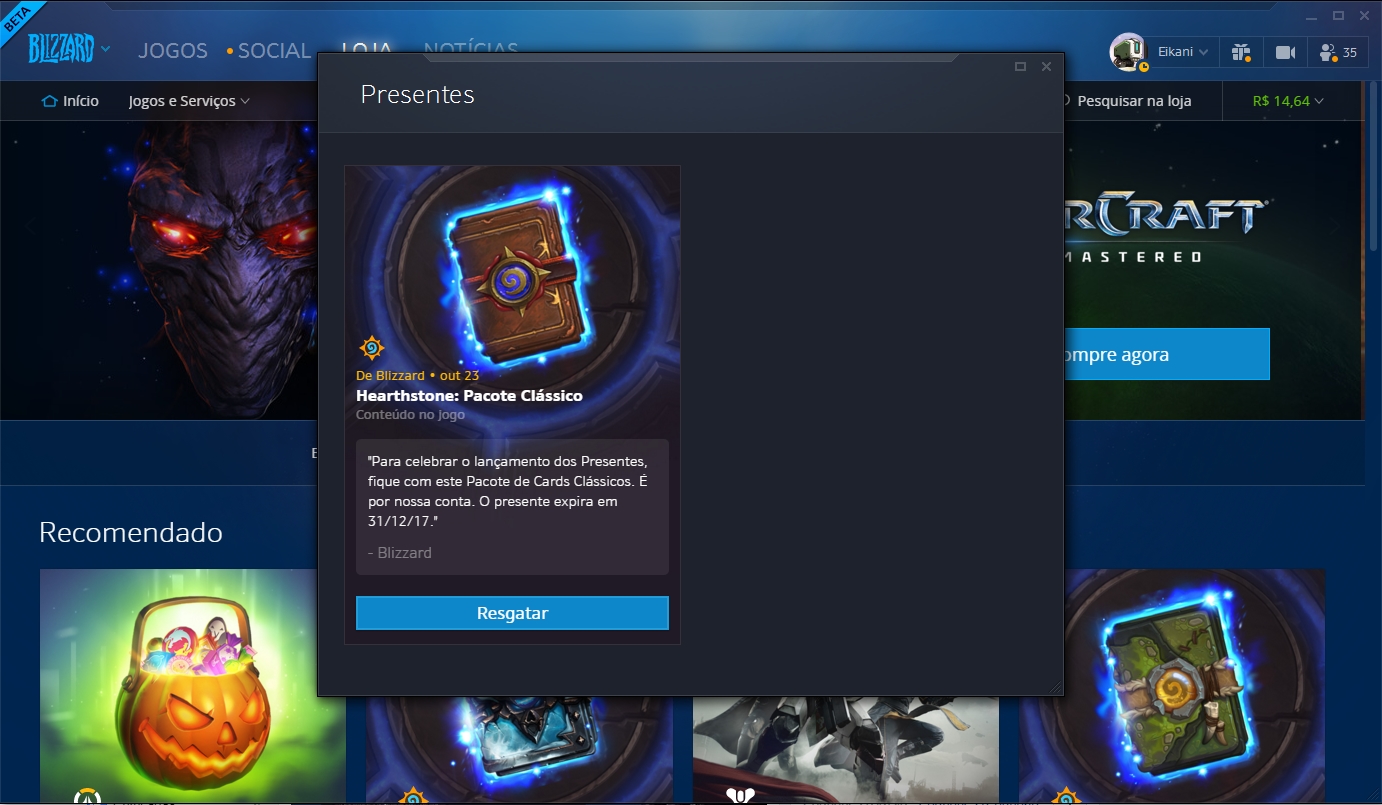 Ah, e a Blizzard presenteou todos os jogadores com um pacote clássico no Hearthstone pra comemorar a chegada da aba de presentes! É só logar e resgatar o seu. O app da Battle.net tem cada dia mais funcionalidades parecidas com a Steam – e isso é ótimo!