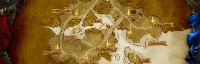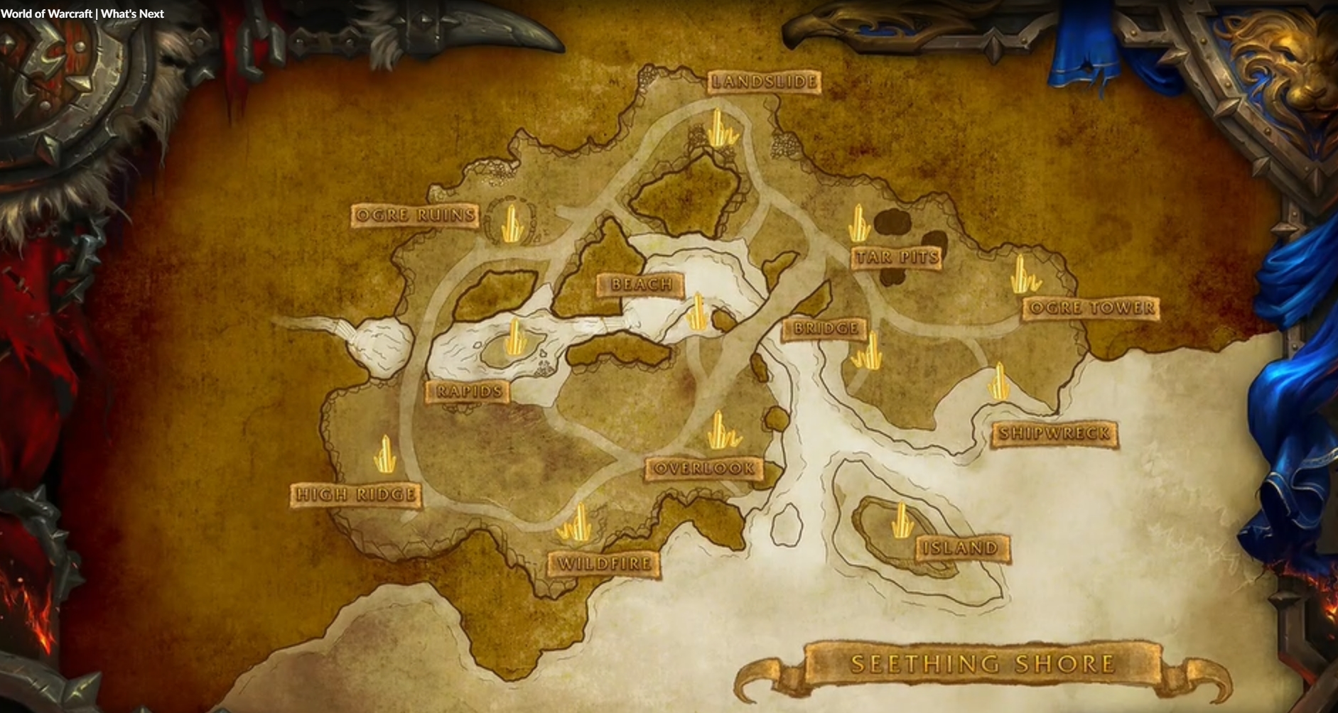 As arenas serão nas principais zonas dos novos continentes, Tiragarde e Zuldazar, e ainda não tiveram mais detalhes revelados. Já o campo de batalha, Costa Fervilhante, teve mais detalhes revelados, incluindo seu mapa!