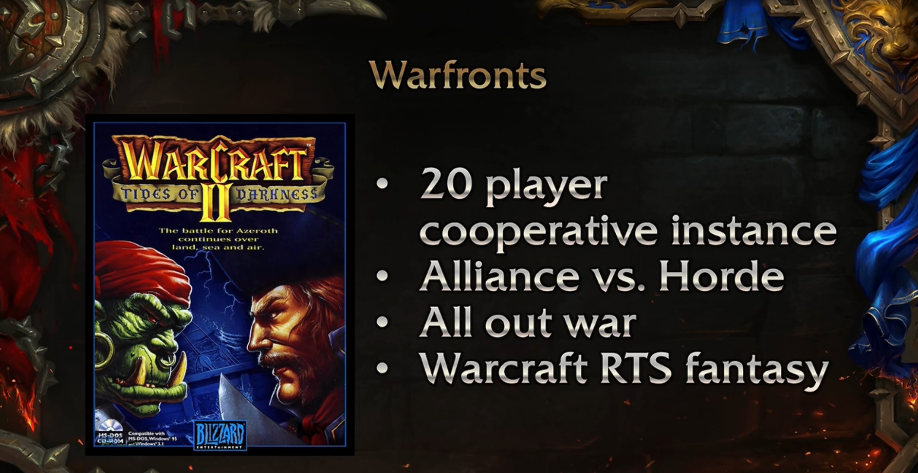 Os Frontes de Guerra vão ser mais um tipo de conteúdo PvE dentro do World of Warcraft, chegando com Battle for Azeroth. Os Frontes de Guerra são uma instância cooperativa de 20 jogadores, com o objetivo de se montar uma base de guerra com um estilo RTS de gameplay, para lutar contra a facção oposta.