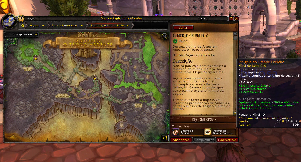 A missão para o novo anel lendário também começou ontem! A missão “A morte de um Titã” requer que você mate Argus, e dá como recompensa um anel lendário baseado na sua especialização e um token com MUITO poder de artefato. Você pega essa missão na Vindicaar. Na imagem, os status do anel que vou receber assim que completar a missão: