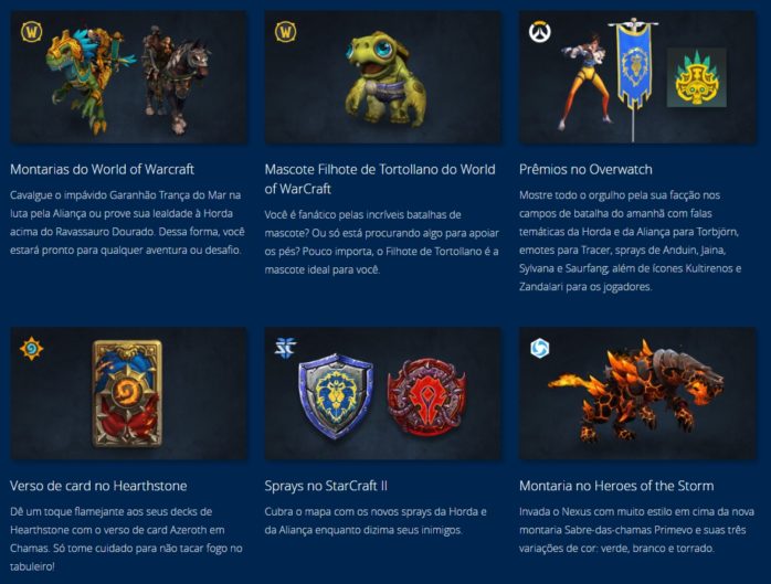 - Overwatch: falas temáticas da Horda e da Aliança para Torbjörn, emotes para Tracer, sprays de Anduin, Jaina, Sylvana e Saurfang, além de ícones Kultirenos e Zandalari para os jogadores.