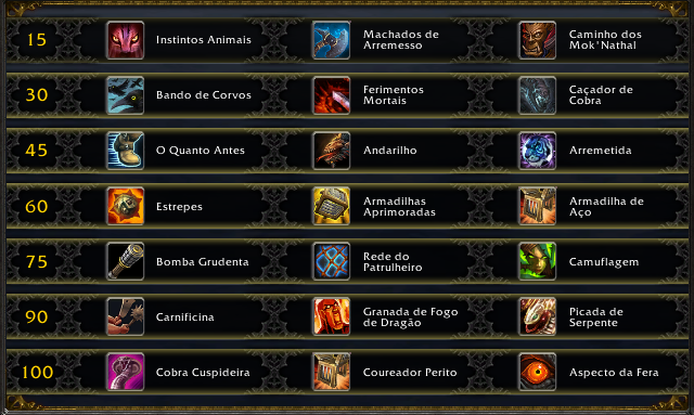 - Caminho dos Mol’Nathal faz com que Golpe do Raptor proporcione Táticas dos Mok’Nathal, aumentando em 3% seu poder de ataque por 8 segundos e acumulando até 4 vezes.