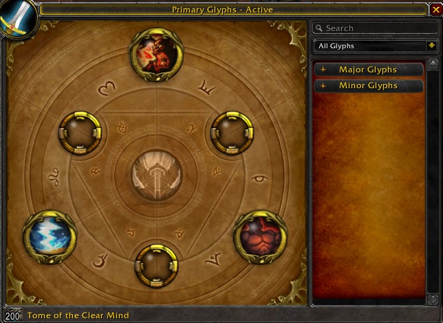 - Glifo de Muralha de Escudos faz com que Muralha de Escudos reduza em mais 20% o dano recebido, mas seu tempo de recarga é aumentado em 2 minutos. Não é um glifo usado normalmente, mas pode ajudar em algumas situações.
