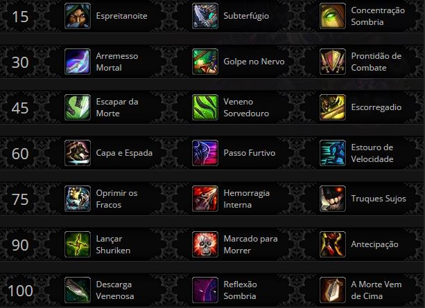 - Truques Sujos: Esfaquear e Cegar não terão mais custo de energia e não serão quebrados pelos seus DoTs. Porém, eles ainda serão quebrados com os DoTs de outros jogadores, então dificilmente este talento tem algum uso no PVE.