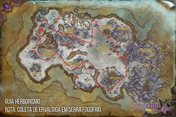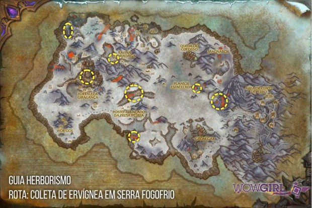 Dica: Por questão de conveniência, colha todas as plantinhas que encontrar nos mapas iniciais. Você encontrará diversas erválgidas enquanto estiver upando, tanto em Serra Fogofrio quanto no Vale da Lua Negra. Se você estiver upando um personagem na Horda, também encontrará ervígneas pelo caminho, pois essas plantinhas só nascem em Serra Fogofrio; se, pelo contrário, seu personagem for da Aliança, aproveite para colher todas as Florestrelas que encontrar no Vale da Lua Negra.