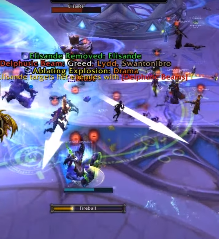 - Feixe Delfúrico: Elisande marcará jogadores aleatórios, e uma seta entre ela e os alvos irá se formar. 4 segundos depois, ela lança um raio de energia na direção deles, que causa 900k de dano arcano ao alvo e todos pegos no caminho entre eles. Apesar de atingir a linha reta completa, ela não causa dano aos jogadores que estiverem atrás das pessoas marcadas. Elisande repetirá o processo mais 3 vezes, atingindo um total de 4 grupos de jogadores com o Feixe.