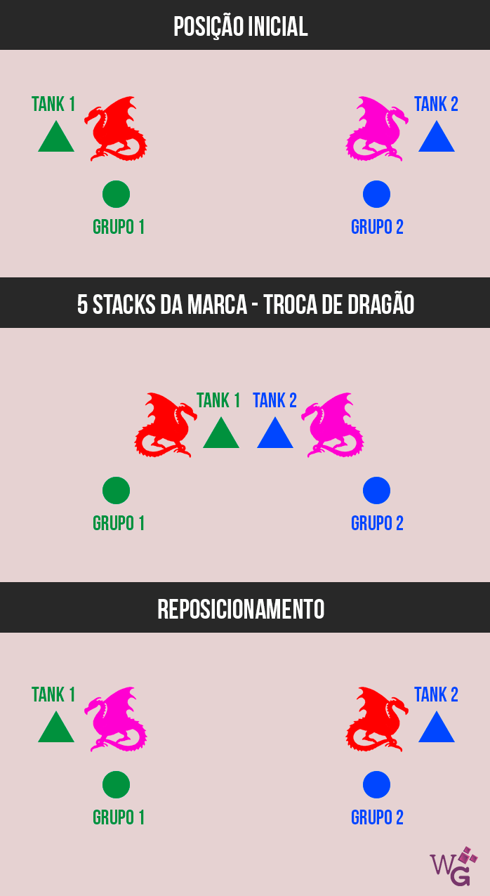 Os DPS e Healers não deverão trocar de lado em nenhum momento. Quanto aos Tanks: a troca de taunts na verdade é uma troca de boss. Quando vocês atingirem 5 stacks da Marca, os tanks deverão “se encontrar” no meio do caminho, tauntar o boss do tank oposto, e trazê-los de volta para seu lado. Ficou confuso? Então dá uma olhada aqui:
