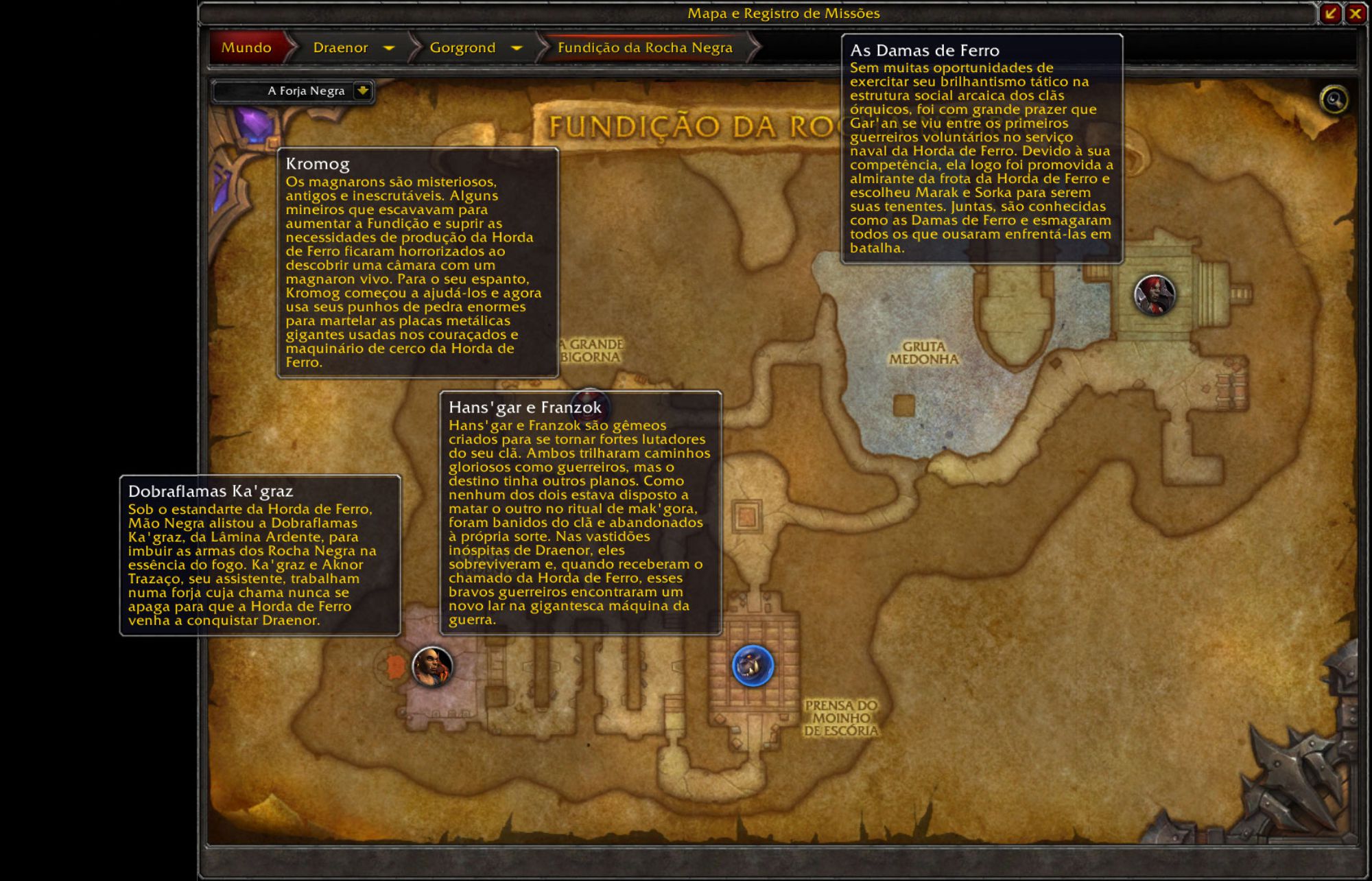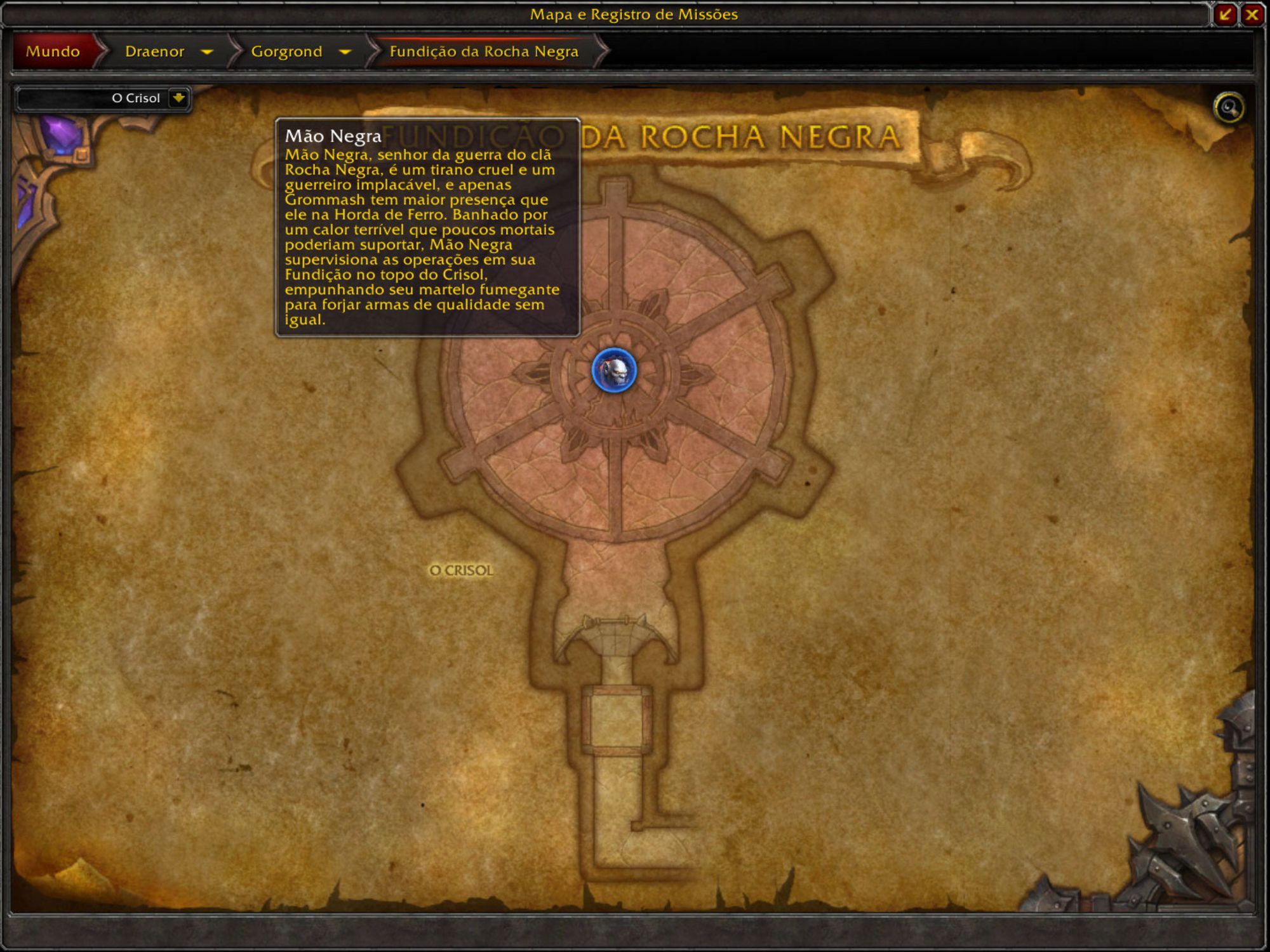 Essa fundição era o lar ancestral dos orcs da Rocha Negra, onde mestres ferreiros derretiam e moldavam o minério duríssimo que dá nome ao clã. Agora, gigantes capturados e domados pelo Senhor do Trovão aquecem as grandes forjas. Dobraflamas da Lâmina Ardente imbuem o minério com fogo interior e engenheiros moldam a escória de acordo com instruções de outro mundo. A forja do Senhor da Guerra Mão Negra é o centro do poder militar da Horda de Ferro e produz as armas que serão usadas para arrasar Azeroth.