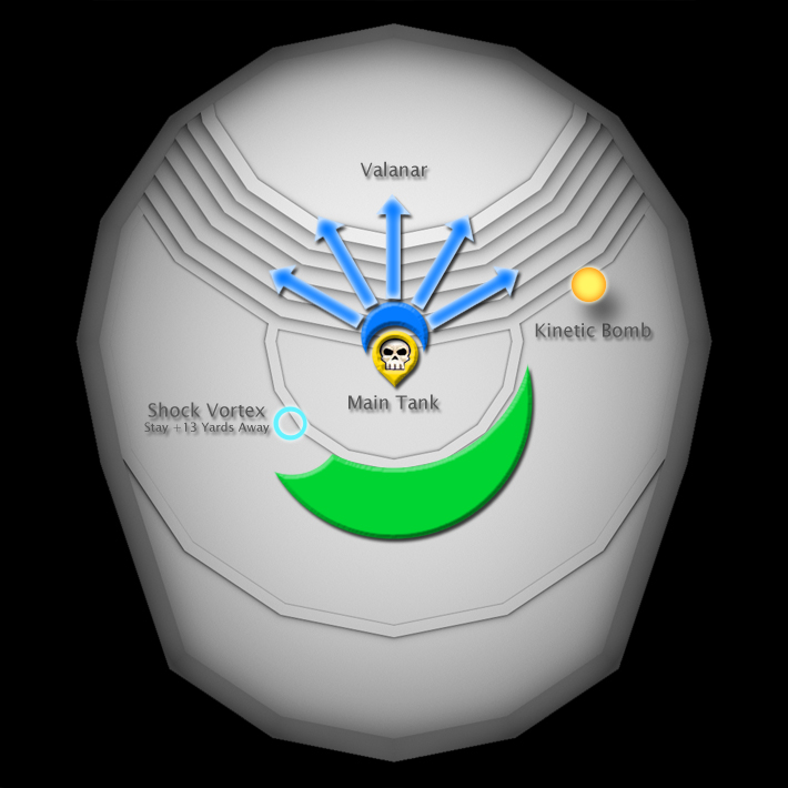 No Valanar, a raid precisa sempre prestar atenção no Shock Vortex, que parece com um loop de eletricidade no chão. Depois de alguns segundos, começa a explodir, dando dano e knock back em qualquer um que esteja em até 13 yardas. Valanar sumona uma Kinetic Bomb, que é um orb brilhante que fica flutuando durante a batalha. Conforme o tempo passa, a bomba desce e se chega a atingir o solo, explode, dando dano e knock back em todos até 50 yardas. É necessário dar dano na orb, para mantê-la no ar. Um player deve ficar responsável por dar dps na bomba e impedir que ela toque o chão.