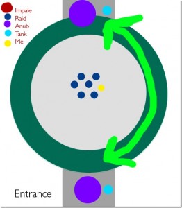 Como Anub bate demais, o ideal são 2 healers no Main Tank e 1 healer no Off Tank e raid. Se tudo der certo e se espalharem pra mitigar o dano do Impale, a raid não leva muito dano.