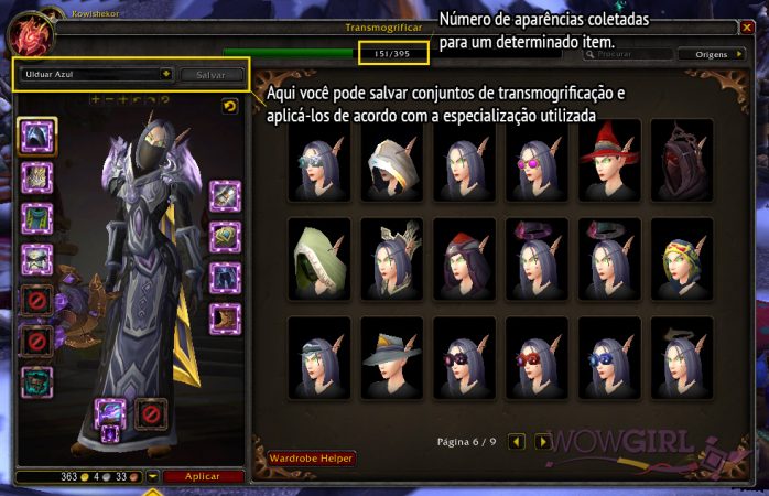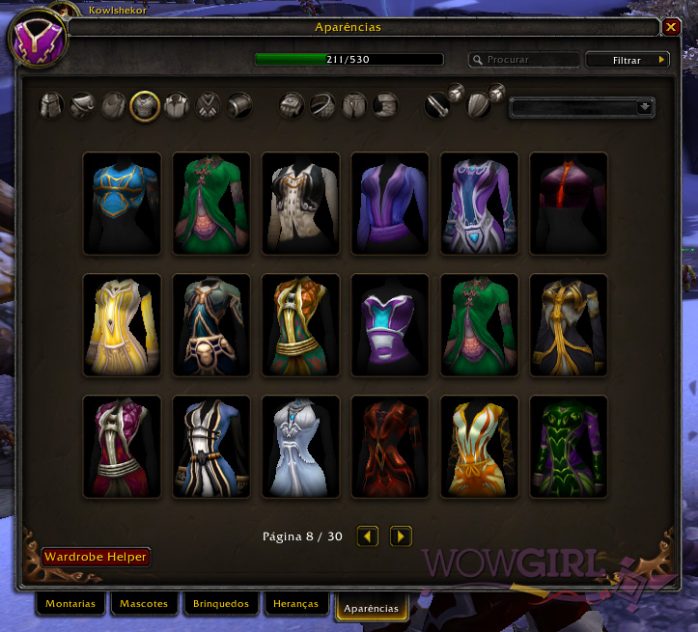 Para transmogrifar seu equipamento ainda é preciso ir em um transmogrificador, mas você pode visualizar os itens que já tem ao usar o atalho SHIFT + P > Aba “Aparências”.