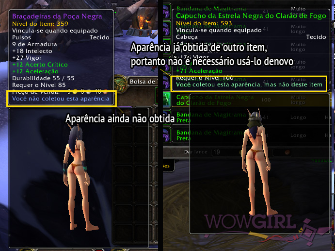Caso você possa equipar o item e não possui a aparência ainda, a mensagem “Você não coletou esta aparência” será mostrada no tooltip do item ao passar o mouse; caso já tenha a aparência de outro item, a mensagem “Você coletou esta aparência, mas não deste item” será exibida; caso já tenha uma determinada aparência de um item único, nenhuma mensagem será exibida.