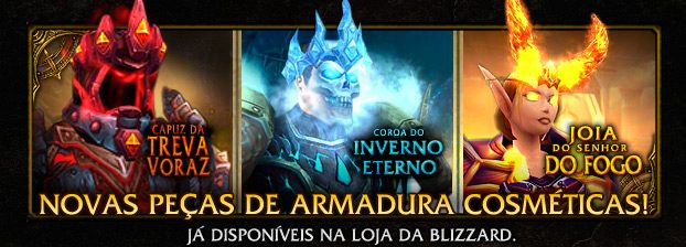 Até que pra quem não tinha previsão de lançamento, os elmos para transmog chegaram bem rápido à Blizzard Store! A partir de agora você pode comprar a Coroa do Inverno Eterno, a Jóia do Senhor do Fogo e o Capuz da Treva Voraz – elmos estéticos que podem ser utilizados para transmog em qualquer raça e classe. Confira as imagens deles com detalhes: Foi criada uma nova categoria de item para os elmos – as Armaduras Cosméticas. Eles podem ser transmogrificados sobre qualquer tipo de elmo: tecido, couro, placas, ou malha. Uma cópia dele vai ser enviado por email pra todos os seus personagens, como era feito com os mascotes. Além disso, ele é Vinculado à Conta, e pode ser enviado por email como qualquer item de Herança, inclusive para personagens de outra facção. Cada elmo tem uma história por tras, tentando se adequar à lore de determinados cenários, como Nortúndria e...