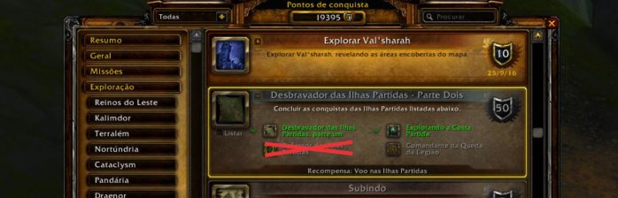 Olá, pessoal! Uma das partes mais esperadas das expansões é o desbloqueio do voo, e não seria diferente em Legion! Com a chegada do 7.2 teremos mais uma conquista para finalmente podermos voar nas Ilhas Partidas. A conquista é a Broken Isles Pathfinder, Part Two e tem alguns requerimentos similares à parte um. Os requerimentos são: Quando a Blizzard anunciou que poderíamos voar no 7.2 e mostrou a conquista acima, havia mais um requerimento: a conquista Breaching the Tomb. Ela acabou sendo removida dos requisitos, pois é bastante longa. Abaixo explicarei como conseguir cada uma das partes da conquista principal. Desbravador das Ilhas Partidas, Parte Um Esta é a única das conquistas acima que já pode (e deve) ser feita para agilizar o desbloqueio do voo no 7.2. Dentro desta conquista há outras cinco: A recompensa desta conquista é o aumento na Velocidade de Montaria nas Ilhas Partidas. São requerimentos bem...