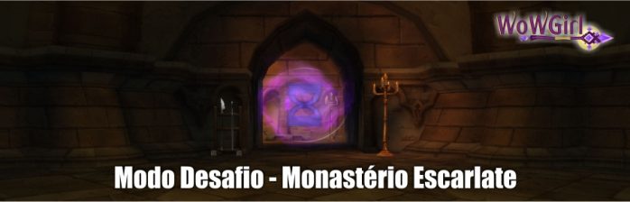 O Monastério Escarlate é considerada uma das masmorras no Modo Desafio em que a dificuldade é de nível difícil. Tempos necessários para cada medalha: Ouro: 13:00 Prata: 22:00 Bronze: 45:00 No começo da masmorra, o grupo deve seguir pela esquerda, passando por cima da Pilha de Corpos. Andar nela vai fazer com que o Cadáver Zumbificado, a Lança-chamas Escarlate e o Centurião Escarlate apareçam (pull 1). Vocês devem matar eles o mais rápido possível, com habilidades de dano em área. Não se esqueçam de usar uma pré-pot antes do pull, pra morte deles ser mais rápida. (Poção do Poder Mogu para Força, Poção da Serpente de Jade para Inteligência, Mordida de Vermingue para Agilidade). Quando tudo estiver morto, vocês poderão continuar pela esquerda sem agrar mais nada, absolutamente nada, até chegar ao Zumbi Energizado. Nessa parte, se tiver um Cavaleiro da Morte, vocês terão uma grande vantagem, já que ele poderá controlar um Zumbi Energizado enquanto os outros DPS matam...